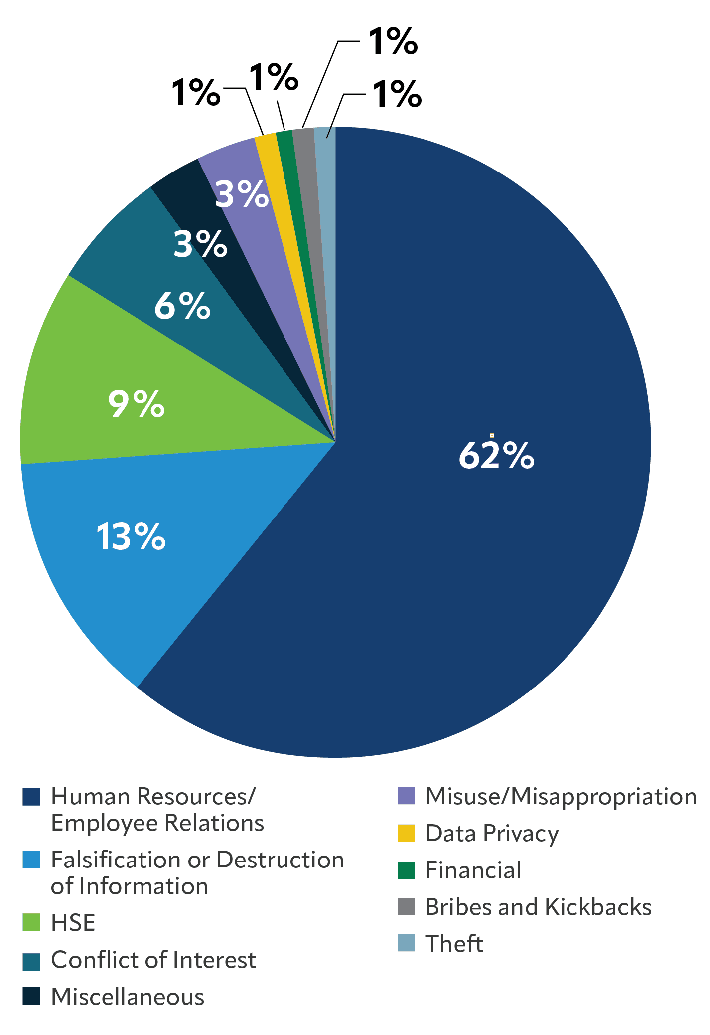 Reported concerns included human resource-related concerns such as harassment and retaliation (62%); falsification or destruction of information (13%); and health, safety and environmental (9%).