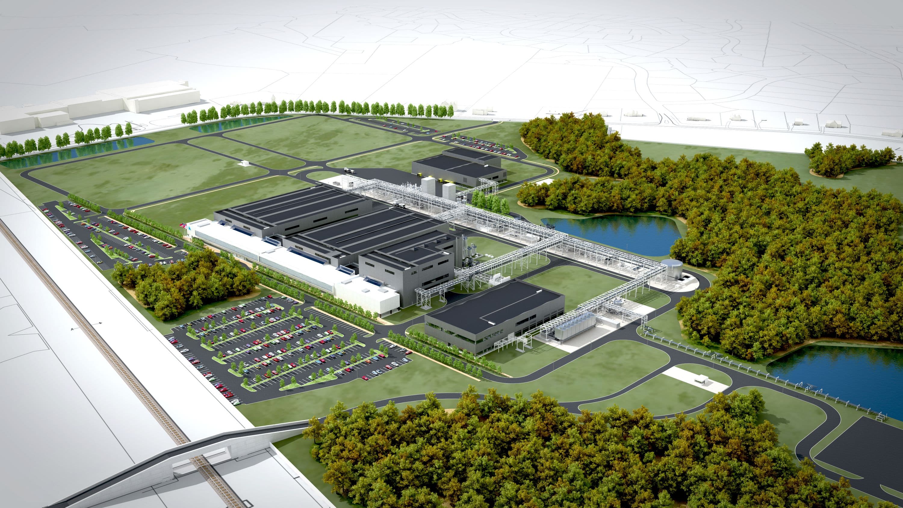 The new facility measures 800,000 square feet and has a footprint of 85 acres, the equivalent of approximately seven football fields. The greenfield facility includes a Central Utilities Building (CUB), offices and labs, a warehouse and three manufacturing plants.